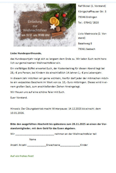 Abschließend bedankte sich Ralf noch einmal für die enorme Vielfalt der geleisteten Arbeit, für die tollen Erfolge und für den Einsatz aller Aktiven auf dem Platz und hinter den Kulissen. Mit den besten Wünschen für das vor uns liegende Jahr beschloß Vorstand Ralf Bickel die Versammlung und wünschte noch einen netten Abend in gemütlicher Runde. Natürlich war auch ein schmackhafter Imbiss bereit. Danke an alle und alles Gute für die Zukunft dem Hundesportverein Endingen.